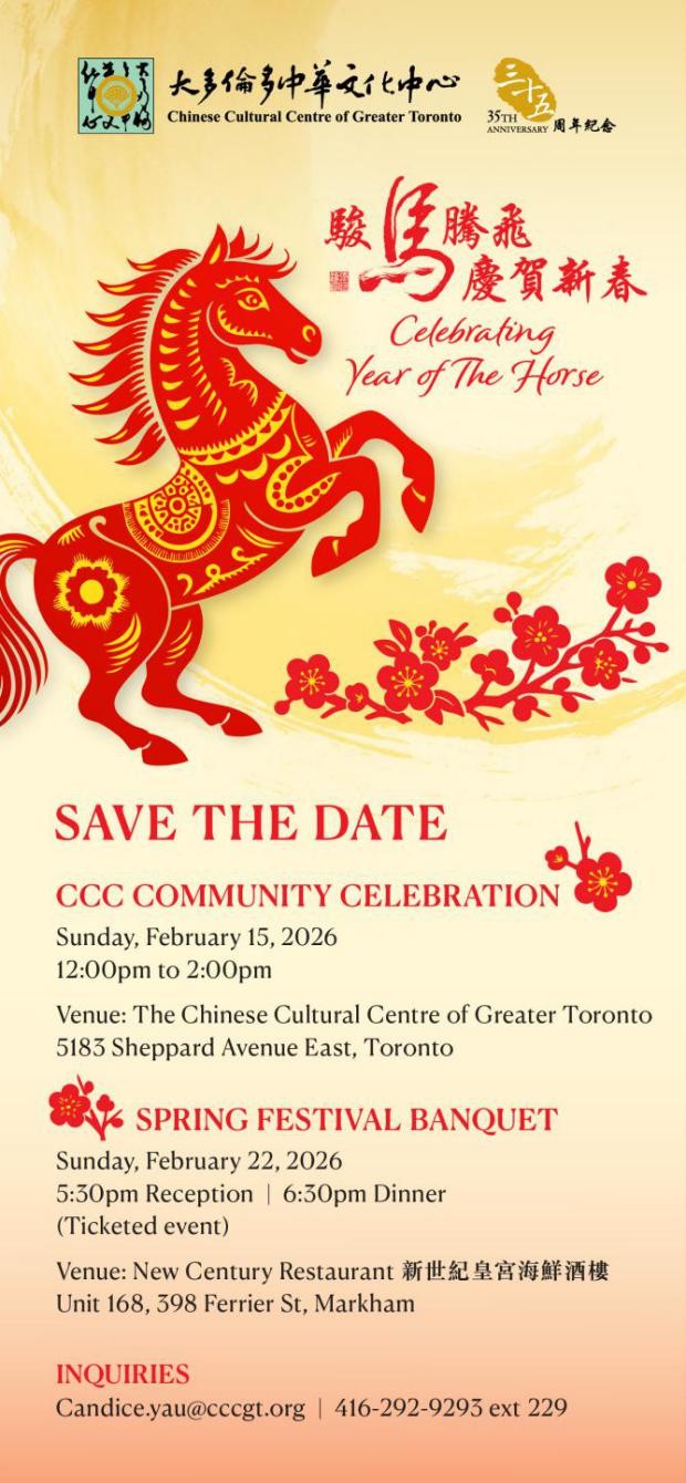 2月22日,大多伦多中华文化中心还将举办马年新春晚宴,汇聚政商侨界嘉宾,共话新春愿景。