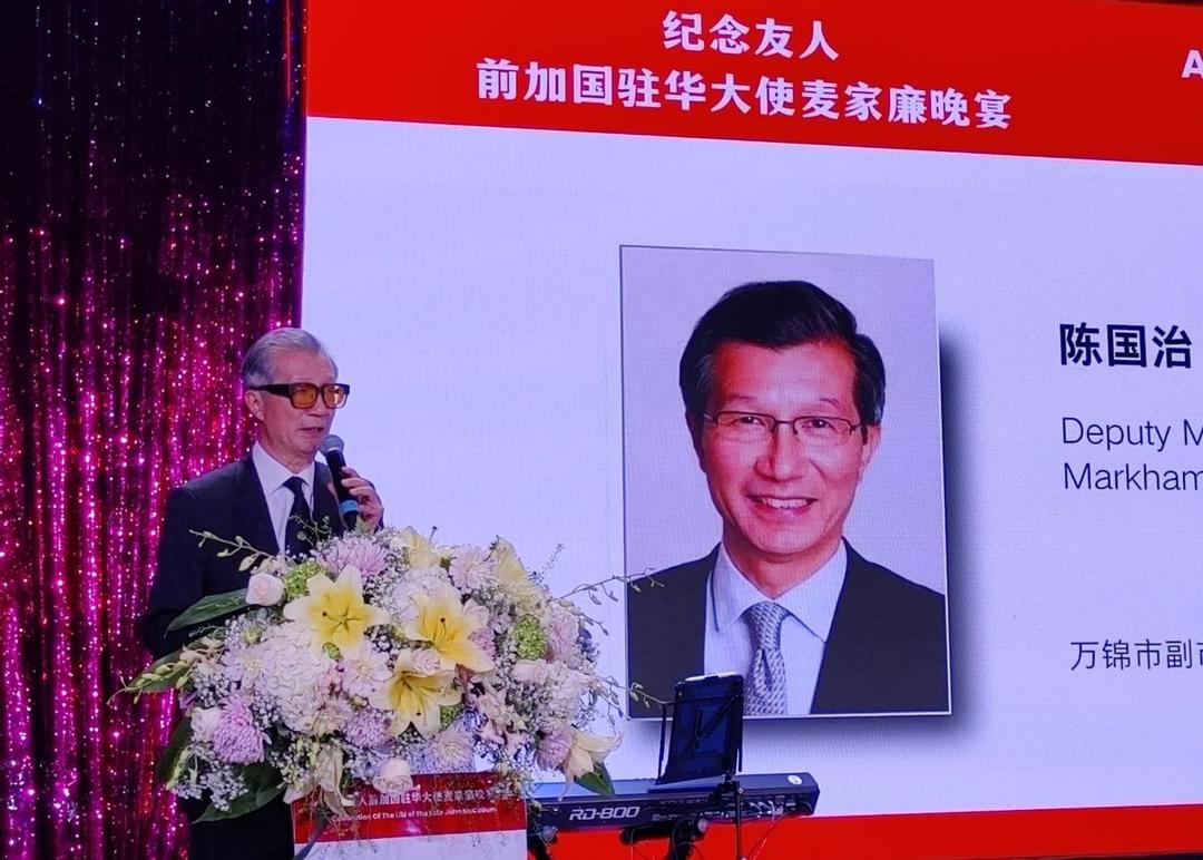 加拿大共工新闻社多伦多讯(记者 孙瑞祥)当地时间10月13日晚,由万锦市华联协会(FCCM)和万锦市副市长陈国治、会计师沈浩倡导,十位联合主席共同主办的纪念加拿大前驻华大使麦家廉追思会在万锦市金瑞麟酒店举行。麦家廉亲属、加拿大三级政府政要及各界代表五百余人出席。