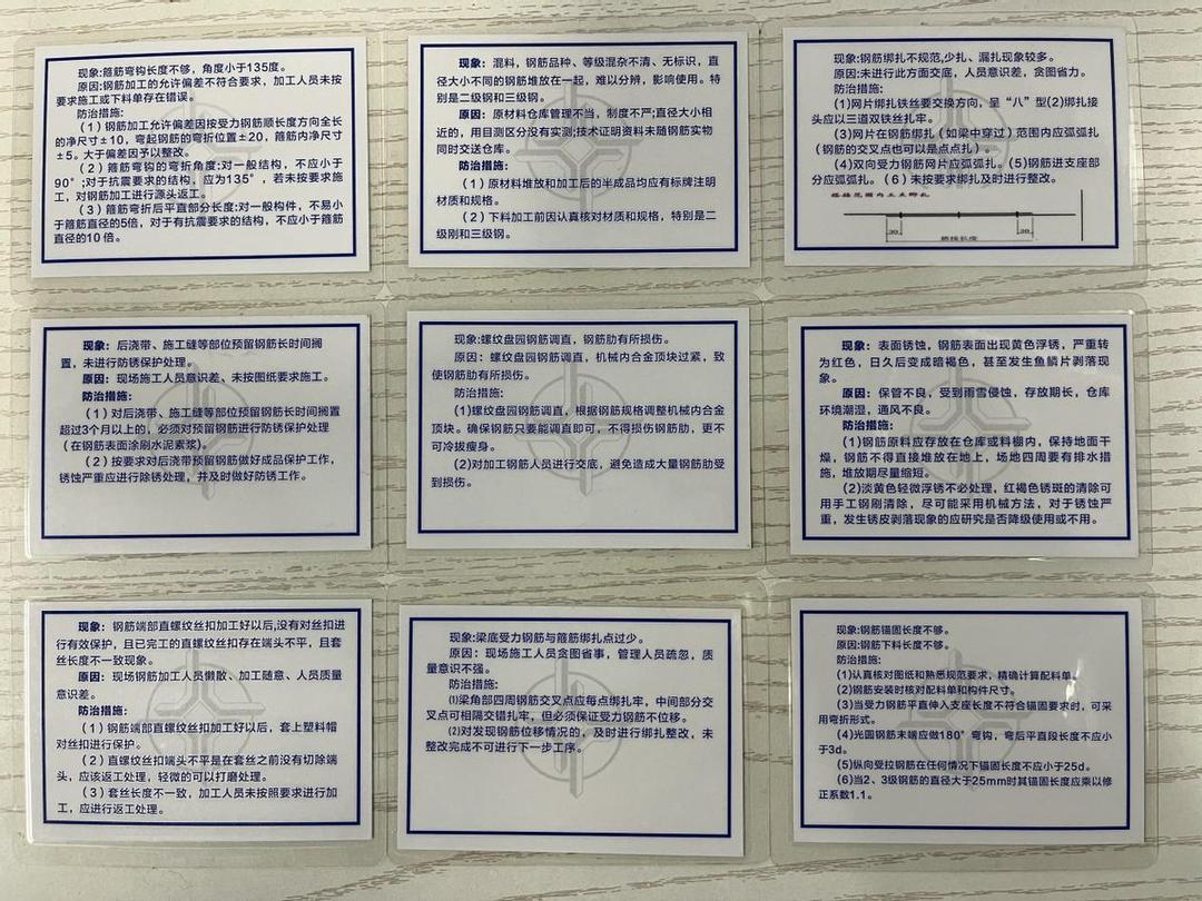 说干就干。王滨立刻组织技质、工程等部门联合梳理常见问题。他们跑遍现场,拍摄了三十多张典型质量缺陷照片:拼缝、错台、麻面……每一张都配上简要说明。反面则是由工人老师傅和技术员共同撰写的“病因分析”和“防治措施”,语言简洁、操作性强,避免专业术语,力求工人一看就懂。卡片设计也花了心思:A6大小,防水塑封,圆角处理,不怕折、不怕脏,甚至穿了孔,可以用绳串起来挂在工具包上。