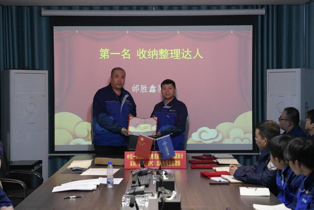 仪式表彰了表现突出的月度优秀员工,以及在中交一航局成立80周年局庆活动中演出的同志。会议重点颁发了职工寝室评选的集体与个人奖项,项目领导田振海为获奖者颁奖并作总结讲话。