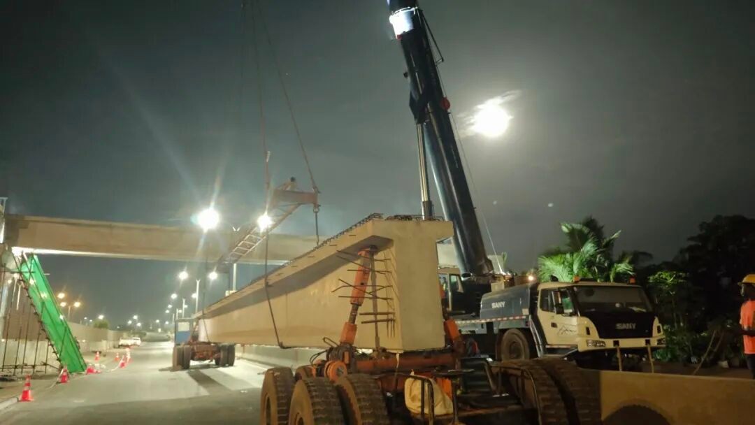 终于,在各方共同努力下,一份详细的交通导改与运梁方案出炉了。为了减少对市民出行的影响,他们常常趁着夜色,抢抓夜间施工,当城市在沉睡,工地却灯火通明。为了让施工“副作用”降到最低,项目团队对沿线居民和商户逐个上门解释,采取有效的噪声控制、粉尘抑制措施。交通导改标识醒目,警示灯、围挡规范设置,时刻提醒着过往车辆和行人注意安全。